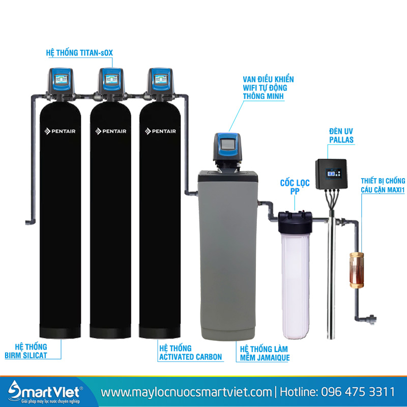 Hệ thống lọc tổng Pentair PWQ06 (bản Plus) gồm: Lõi lọc PP, Cột lọc Birm Silicat, Cột lọc Titan-sOX, Cột lọc Activated Carbon, Cột làm mềm Jamaique, Đèn UV Pallas, và Thiết bị chống cáu cặn Maxi1